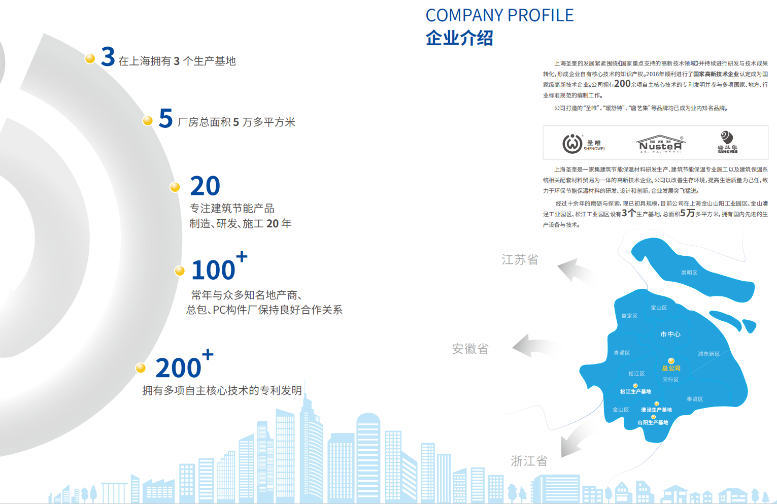 上海圣奎塑业有限公司(以下简称“上海圣奎”)成立于 2005年,是从事新型环保型保温材料及原材料的研发、生产销售及服务于一体的高新技术企业。目前在上海、江苏、山东、河北、安徽等地设有多个生产基地,产能超过100万立方米/年,拥有国内先进的生产设备与技术。