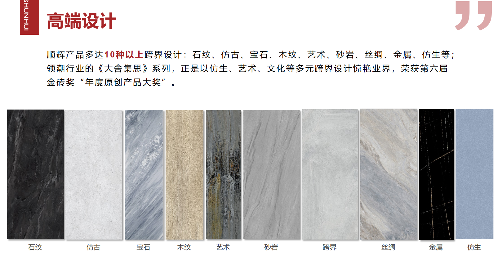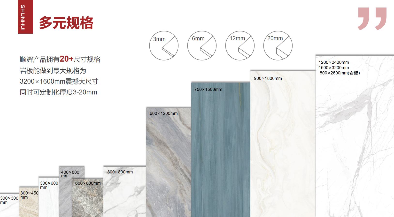 顺辉瓷砖·岩板拥有总面积超4000亩的现代化陶瓷智能工厂、40条大型现代化陶瓷生产线,年产能超1.2亿平方米,生产瓷砖产品1400多款,涵盖陶瓷岩板、大板、瓷抛砖、大理石瓷砖、现代仿古砖、全抛釉瓷砖、中板、花砖、瓷片等品类,提供1200×2400mm、800×2600mm、1200×1800mm、900×1800mm、750×1500mm、600×1200mm、800x800mm、400×800mm、400x400mm等主流规格,满足各类空间装饰所需。